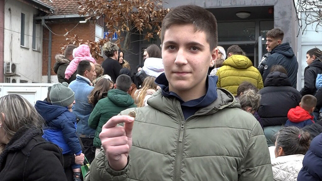 Uprkos kiši, mnogo mališana okupilo se ispred Opštine Gračanica na manifestaciji lomljenja Božićne česnice, događaju koji u ovom mestu već postaje tradicija.