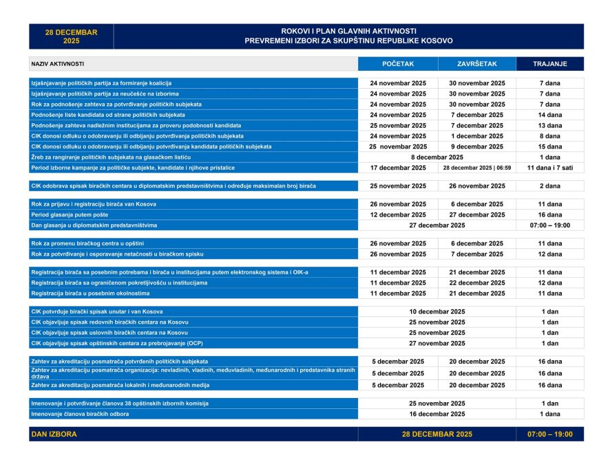 CIK objavio skraćene rokove i plan aktivnosti za prevremene izbore za Skupštinu Kosova, koji će se održati 28. decembra 2025. Svi izborni procesi biće organizovani u periodu od 37 dana.
